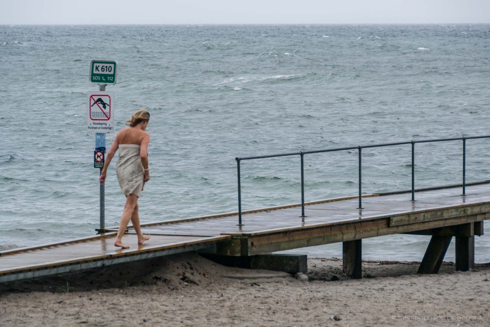 8) La signora che a Vedbaek, in una piovosa mattina, è arrivata in bicicletta, si è cambiata nelle apposite cabine e si è tuffata in mare. O meglio… si è calata con la scaletta rispettando il cartello di divieto di tuffi.