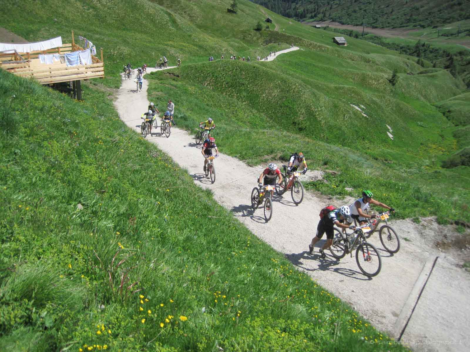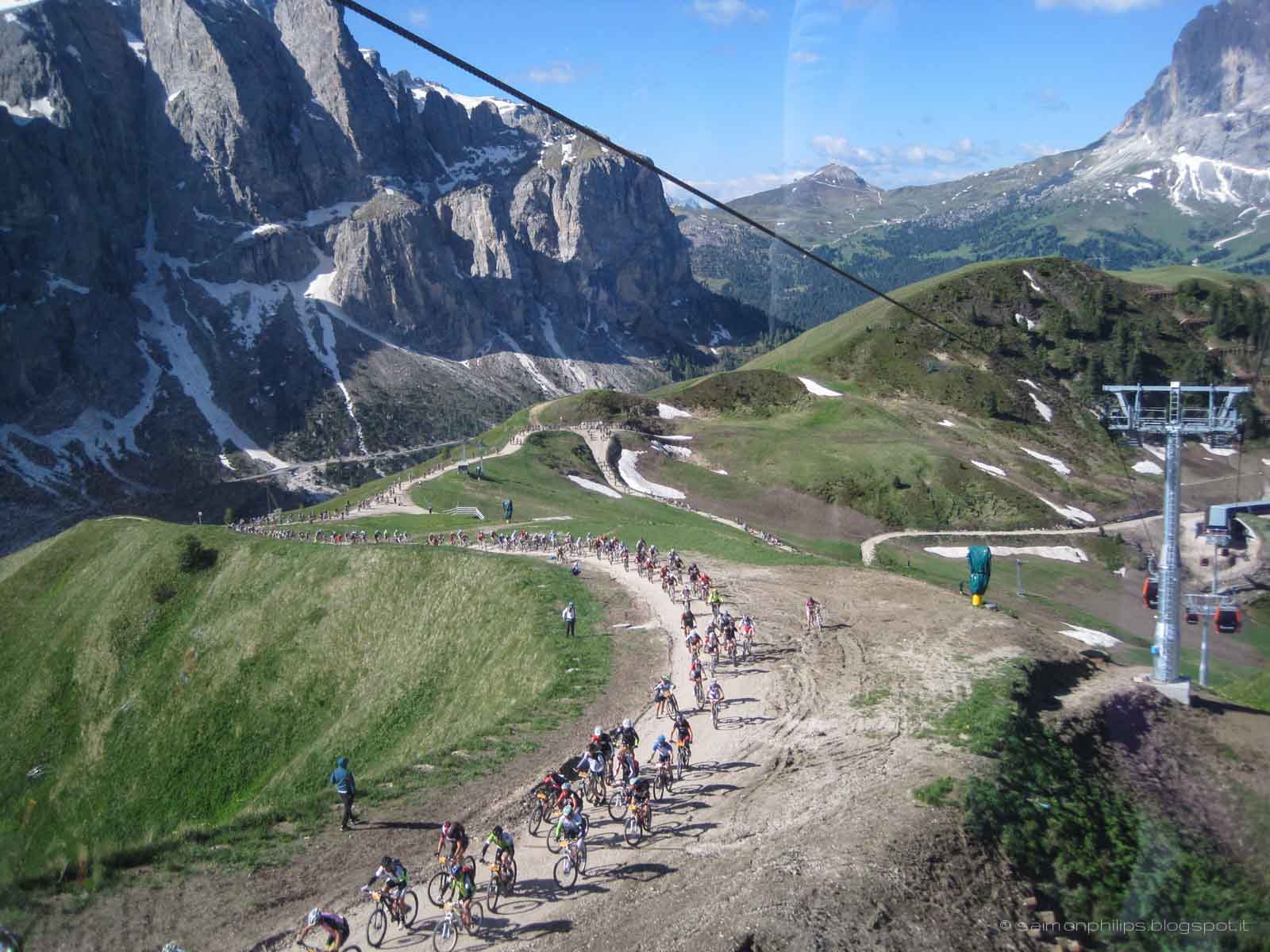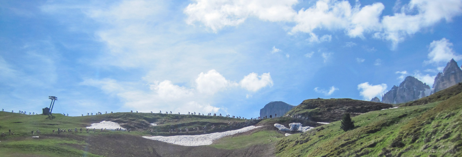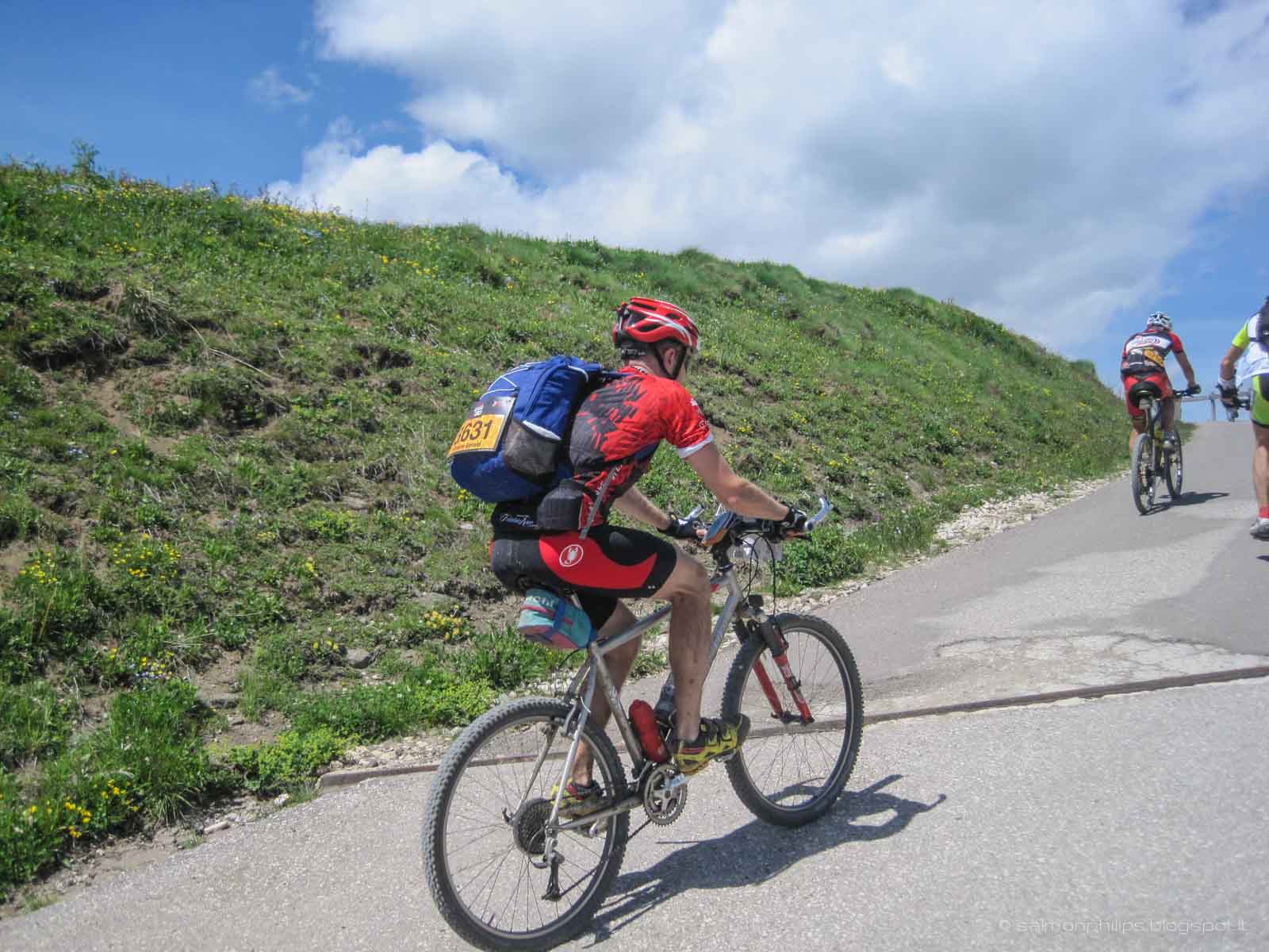 Si sale verso il Pordoi, su sterrato, pendenza costante e pedalabile. Un po’ di fatica affiora, ma poi arrivano i tornanti su asfalto e si respira, peccato finiscano velocemente, si riprende lo sterrato e la strada sale,il penultimo tratto lo faccio spingendo, poi di nuovo in sella. Ci si congiunge col percorso lungo e si affronta un altra coda per superare due tratti sulla neve.