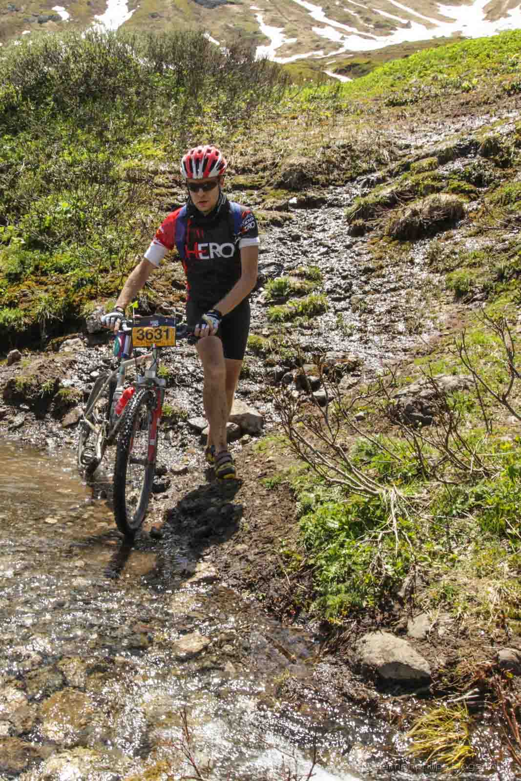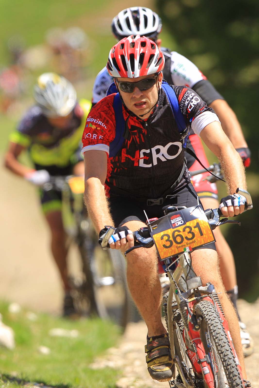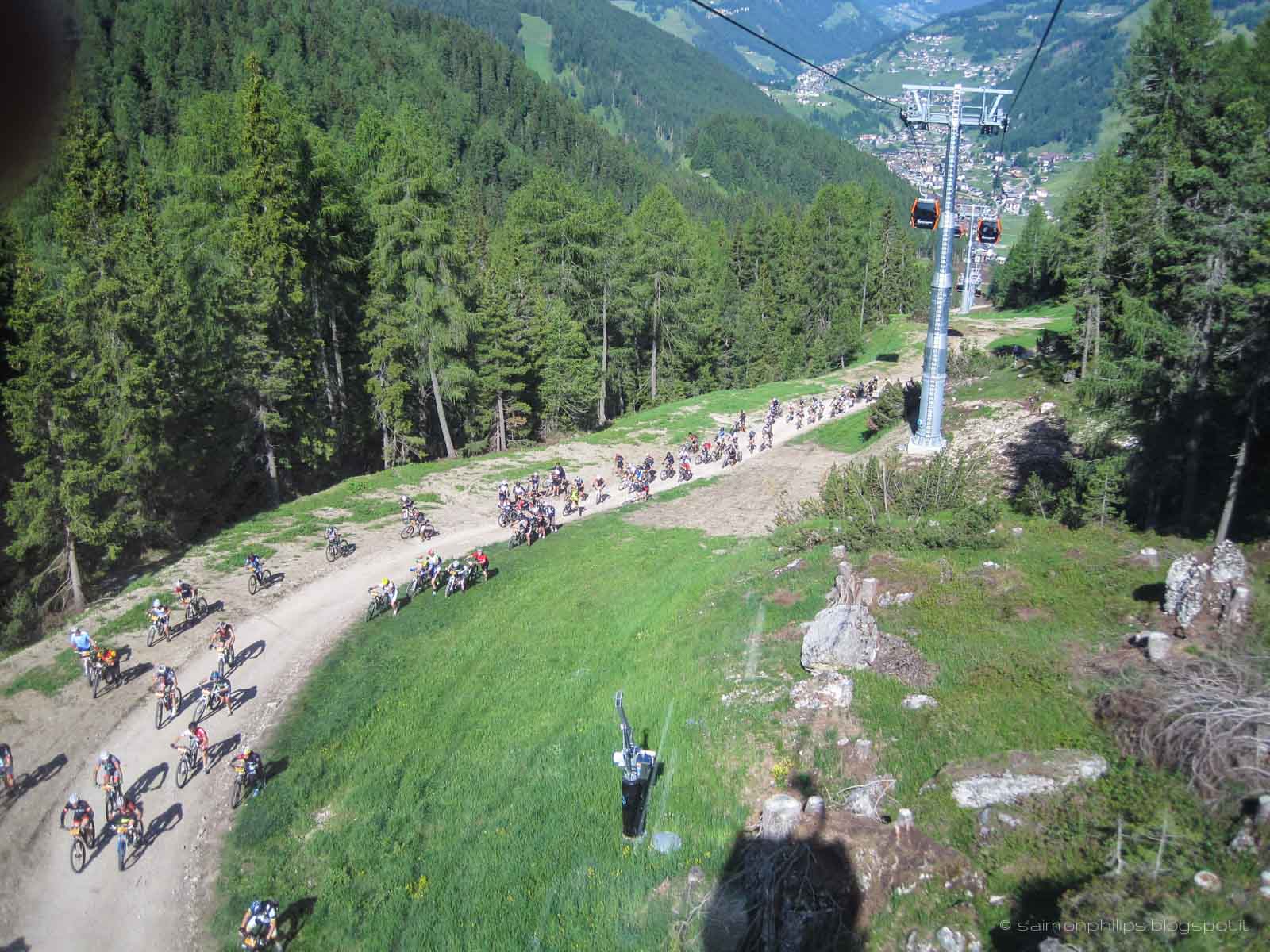 Si sale verso il Pordoi, su sterrato, pendenza costante e pedalabile. Un po’ di fatica affiora, ma poi arrivano i tornanti su asfalto e si respira, peccato finiscano velocemente, si riprende lo sterrato e la strada sale,il penultimo tratto lo faccio spingendo, poi di nuovo in sella. Ci si congiunge col percorso lungo e si affronta un altra coda per superare due tratti sulla neve.