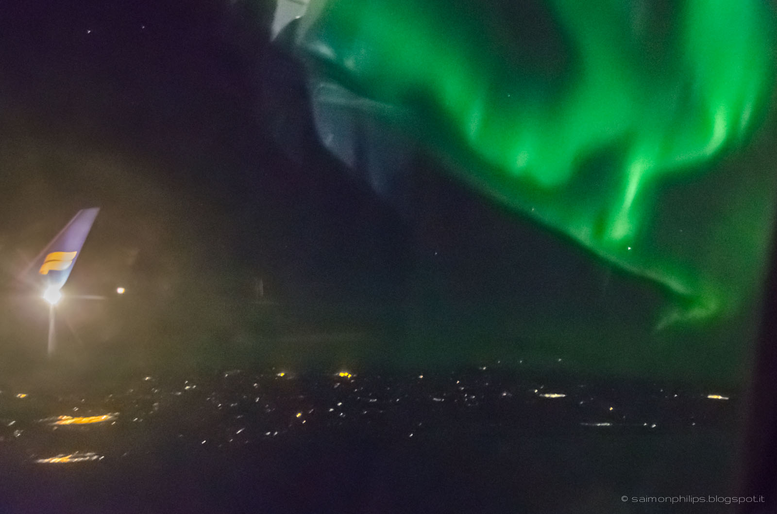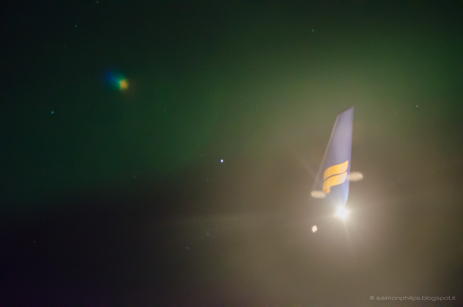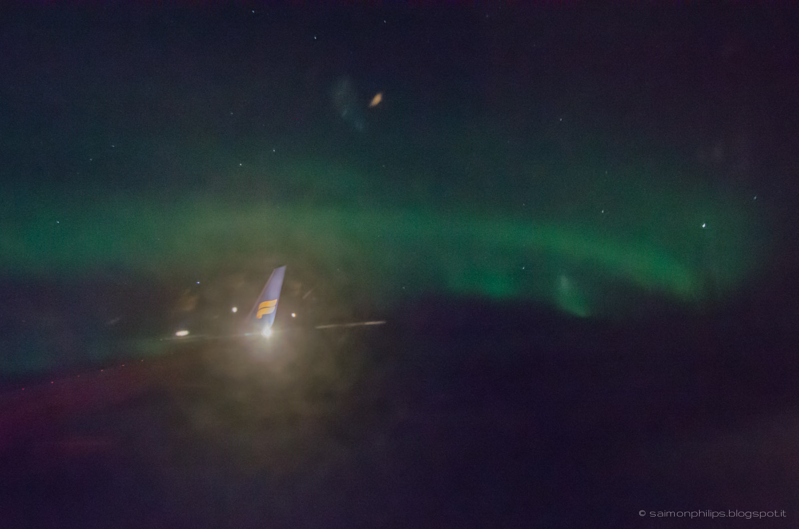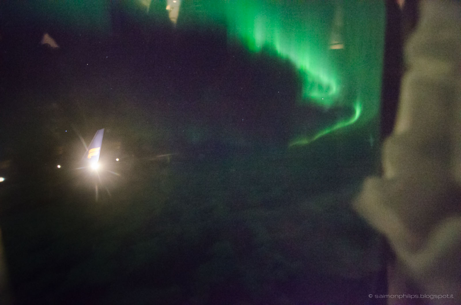 A metà viaggio guardo ancora furtivamente fuori ed inizio ad intravedere uno strano bagliore, prendo la macchina fotografica, copro le luci interne dell’aereo con la giacca e scatto: c`è del verde!!!