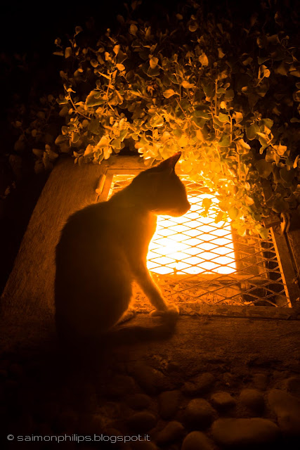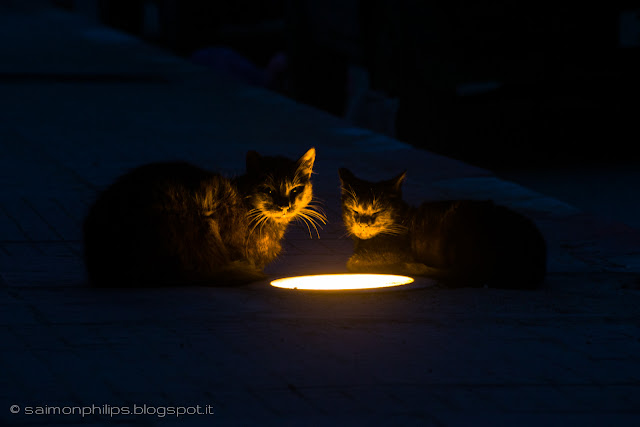 Mentre ci incamminiamo la mia attenzione viene attratta da una bellissima scenetta: due gatti mezzi addormentati si stanno scaldando vicino ad uno dei fari che son presenti sul marciapiede.
