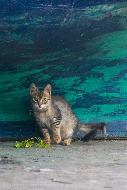 I gatti mi attirano troppo, ce ne sono ad ogni angolo, soprattutto questo piccolino che è intento a giocare con la sua erbaccia nascosto vicino ad una barca rovesciata.