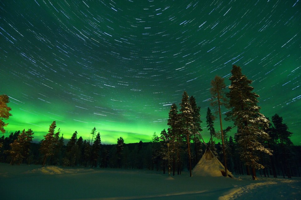 Paesaggio innevato, una tipica kota sami, il ciello stellato ed i volteggi dell’aurora: ecco la foto che cercavo 🙂