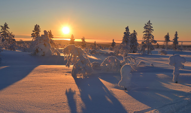 alberi ghiacciati, cielo azzurro ed i colori del tramonto che il sole regala quasi ad ogni ora in questa stagione e a queste latitudini
