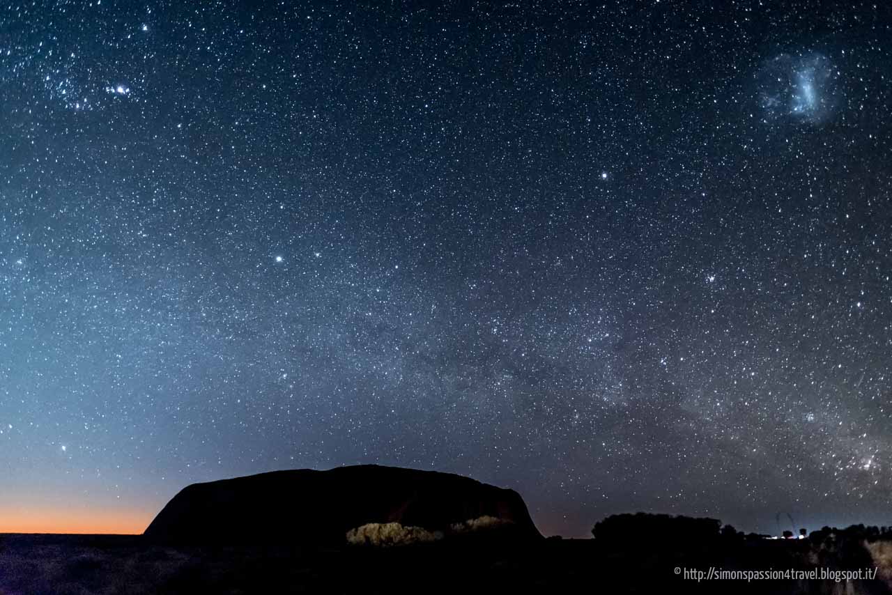 | La sagoma di Uluru sotto le nubi di Magellano, poco prima dell’alba. |