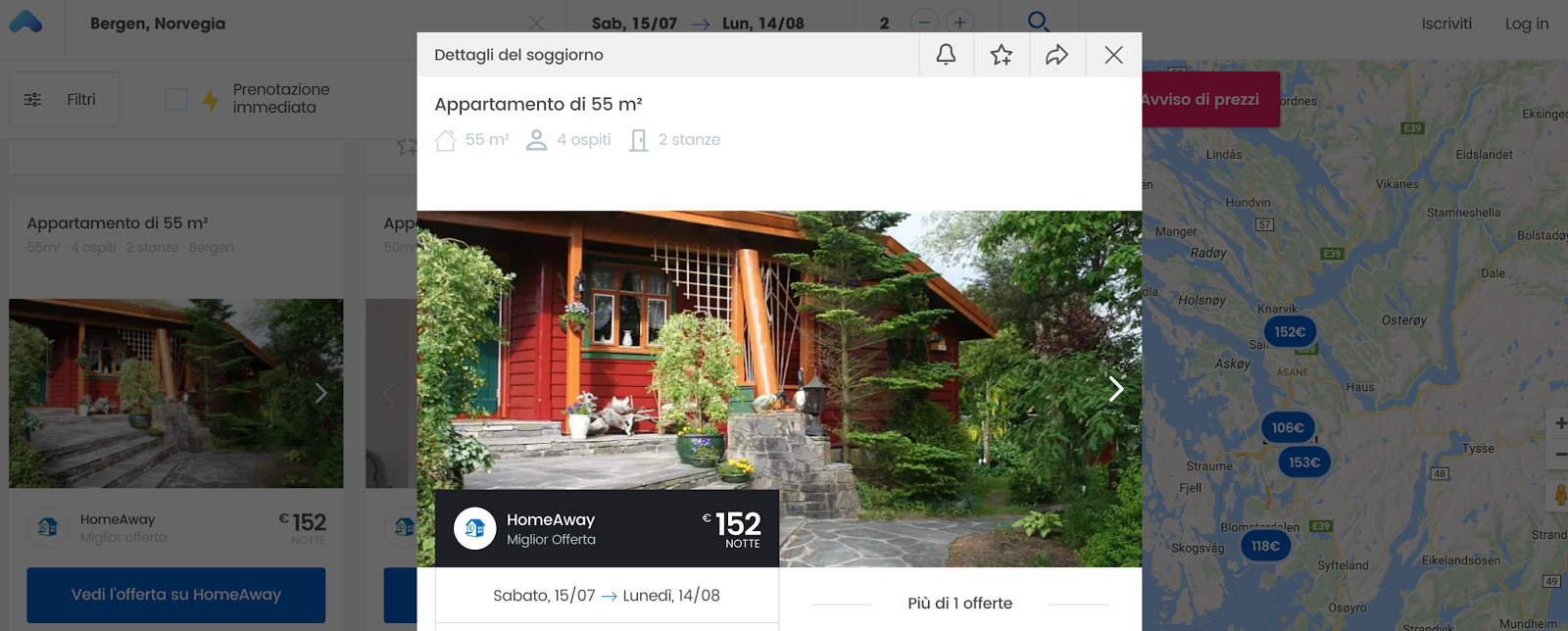 La ricerca si affina e alla fine vengono visualizzati solo i risultati che interessano. Cliccando sulla struttura scelta si apre un pop up in semitrasparenza con riassunte tutte le informazioni utili. E’ possibile scorrere le foto e, se la scelta ci convince, si può approdare direttamente alla pagina di prenotazione di Booking, AirBnB, Homeaway ecc.