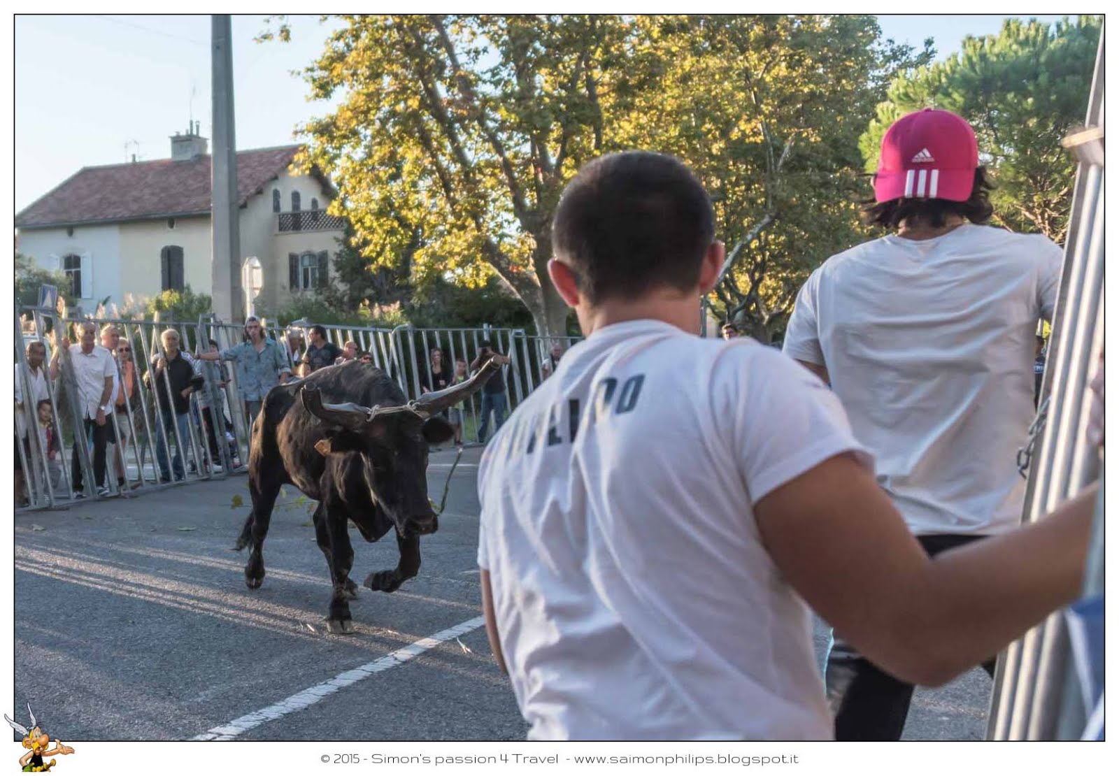 Si tratta delle cosiddette corse camarghesi, specie di corride dove i toreri devono scappare dall’assalto dei Tori, lanciandosi e saltando oltre le barricate che dividono l’arena dagli spalti.