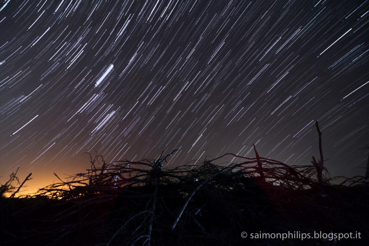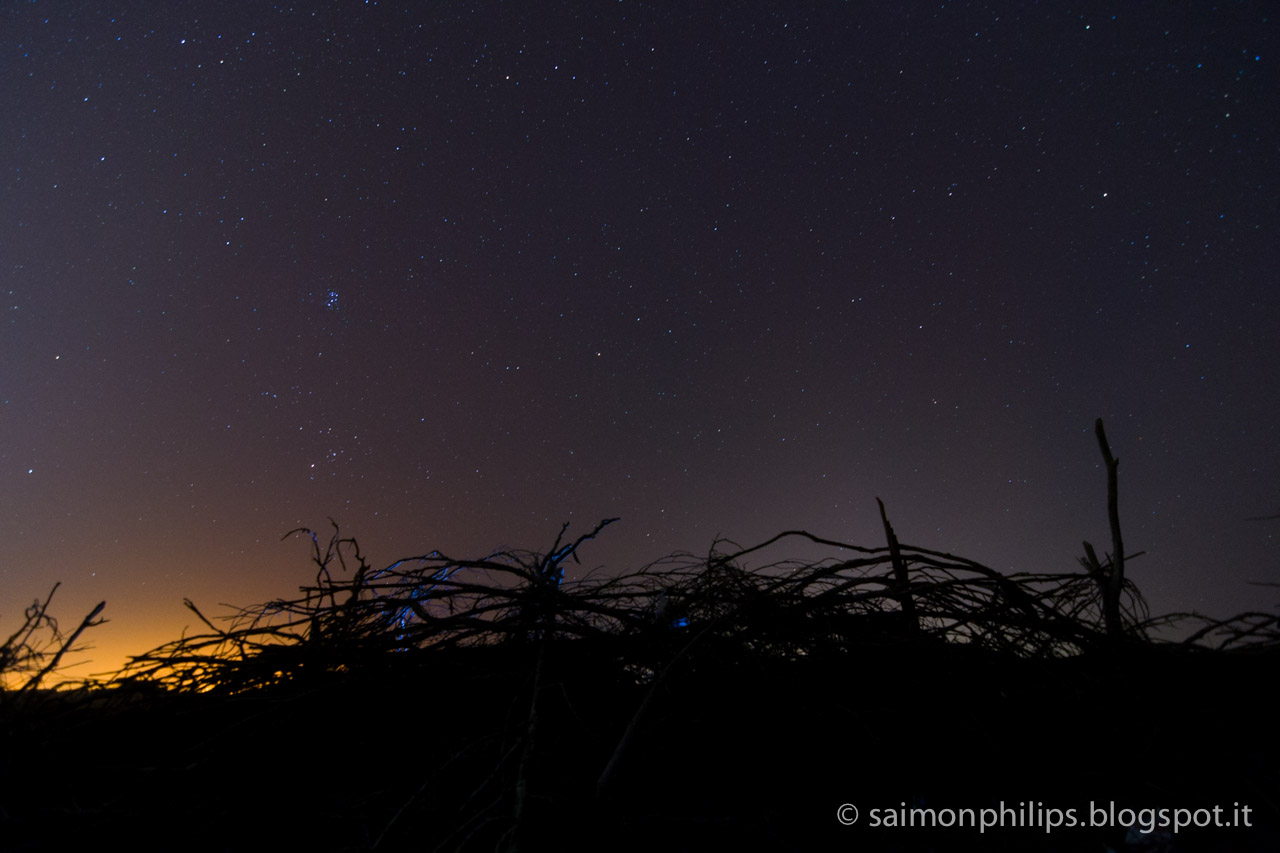 Purtroppo l’umidità, così piacevole al mattino, crea un alone bianco che diffonde le luci della città coprendo la volta stellata. Cerchiamo la parte di cielo più scura e con gli arbusti in primo piano sfruttiamo questa luminosità di sottofondo.