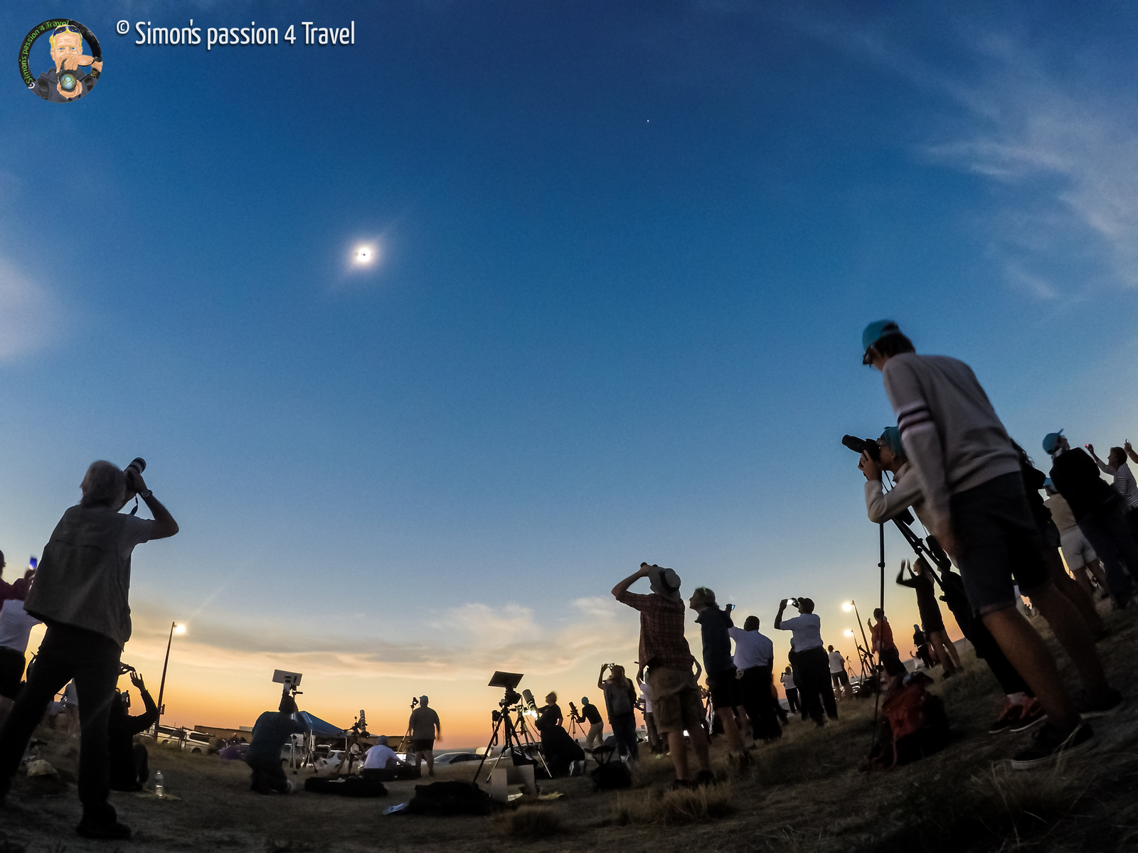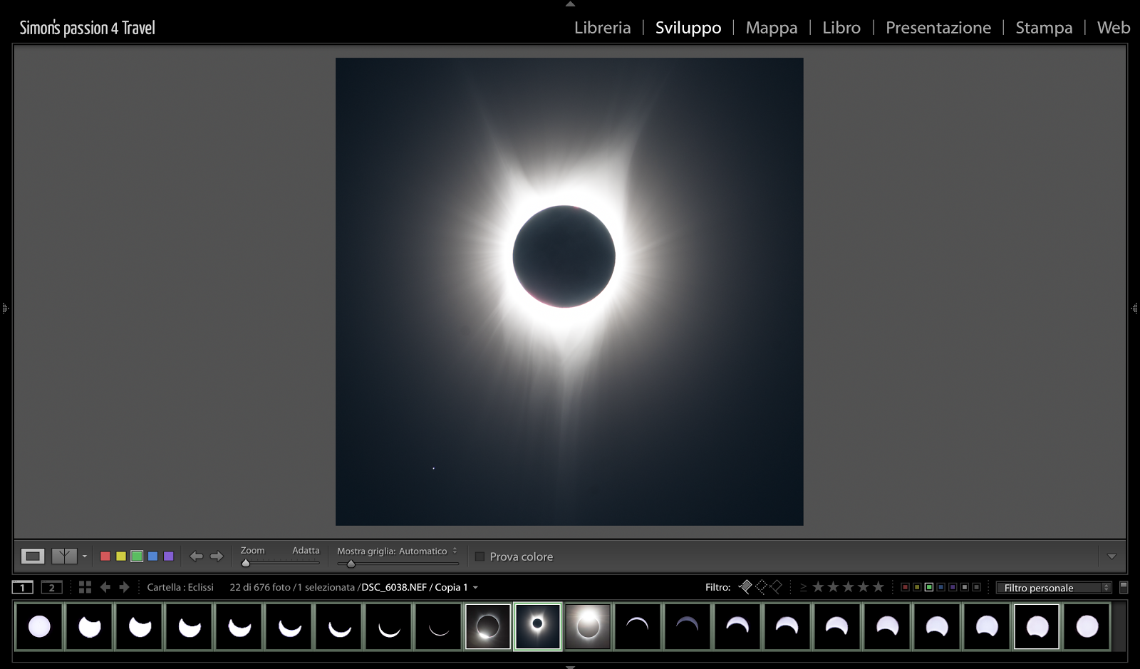 Ebbi tutto il tempo di preparare la mia attrezzatura e, alla fine, di inserire le fatidiche coordinate GPS facendo così partire il conto alla rovescia. Questa volta si faceva sul serio, quei secondi che trascorrevano erano realmente in diretta e non più una simulazione al computer. Me ne accorsi a 30 secondi dall’inizio della parzialità (il primo contatto) quando la mia macchina iniziò la sua serie di scatti. Ad un minuto dalla totalità iniziarono le sequenze più complicate e mentre la d750 e il Mac lavoravano al mio posto, io col binocolo in mano mi stavo gustando quello spettacolo proprio come nel filmato che avevo visto qualche anno prima.